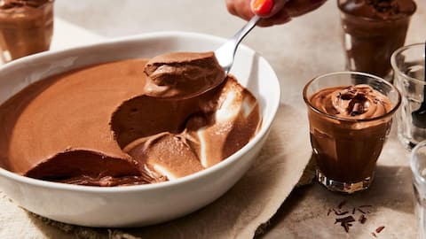 चॉकलेट मूस को बनाने के लिए सबसे पहले एक कटोरे में अंडे की सफेदी और चीनी को डालकर फेंटे, फिर इस मिश्रण में पिघली हुई चॉकलेट मिलाएं। अब एक अलग कटोरे में क्रीम को फेंटे और उसमें वनीला खुशबू मिलाएं। इसके बाद इस मिश्रण को अंडे के मिश्रण में डालकर अच्छे से मिलाएं। अब इस मिश्रण को गिलास में डालकर फ्रिज में रखें। आखिर में इस पर चॉकलेट सीरप डालकर इसे परोसें।