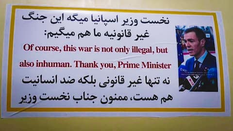 ईरान ने तनाव के बीच अनोखा प्रयोग शुरू किया है। वह अपनी बैलिस्टिक मिसाइलों पर स्पेन के प्रधानमंत्री पेड्रो सांचेज़ की युद्ध विरोधी टिप्पणी का बैनर चिपकाकर उसे इजरायल भेज रहा है। इसका वीडियो सोशल मीडिया पर सामने आया है, जिसमें इस्लामिक रिवोल्यूशनरी IRGC के जवान बैनर चिपकाते दिख रहे हैं। इसमें सांचेज की फोटो के साथ उनका बयान लिखा है, "यह युद्ध न केवल अवैध है बल्कि अमानवीय भी है।" ईरान में इसमें "धन्यवाद प्रधानमंत्री" लिखा है।